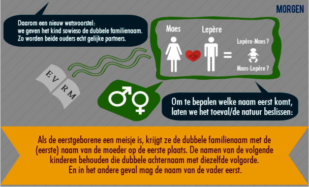 Wat blijkt na lezing van het artikel? Dat we met ons bescheiden voorstel het warm water hebben uitgevonden. Ons aller Constantin was ons namelijk voor. Hij suggereerde om een dubbele familienaam te geven, en dan het geslacht van het kind de volgorde te laten bepalen: indien dochter, eerst naam van de moeder, indien zoon, eerst naam van de vader. De natuur/het toeval konden hun werk doen, discriminatie weggewerkt, kous af.